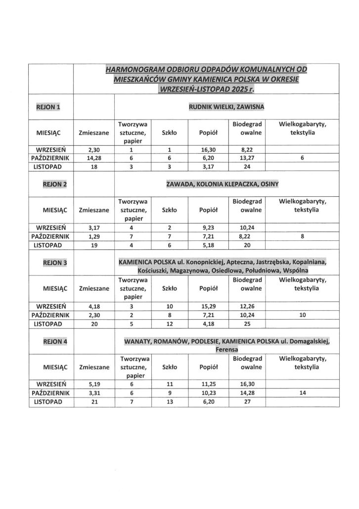 🗓️HARMONOGRAM ODBIORU ODPADÓW KOMUNALNYCH: WRZESIEŃ - LISTOPAD/2025 r.♻️