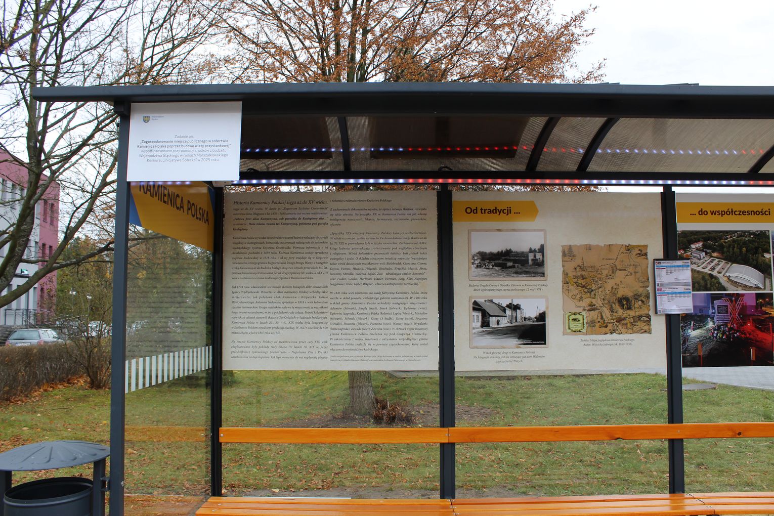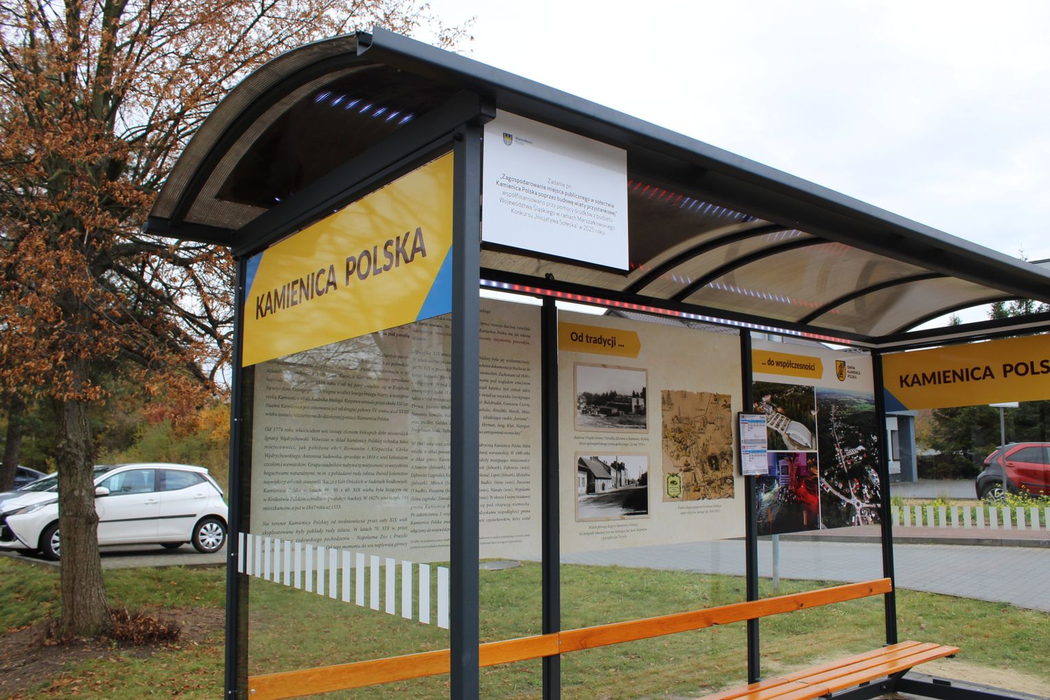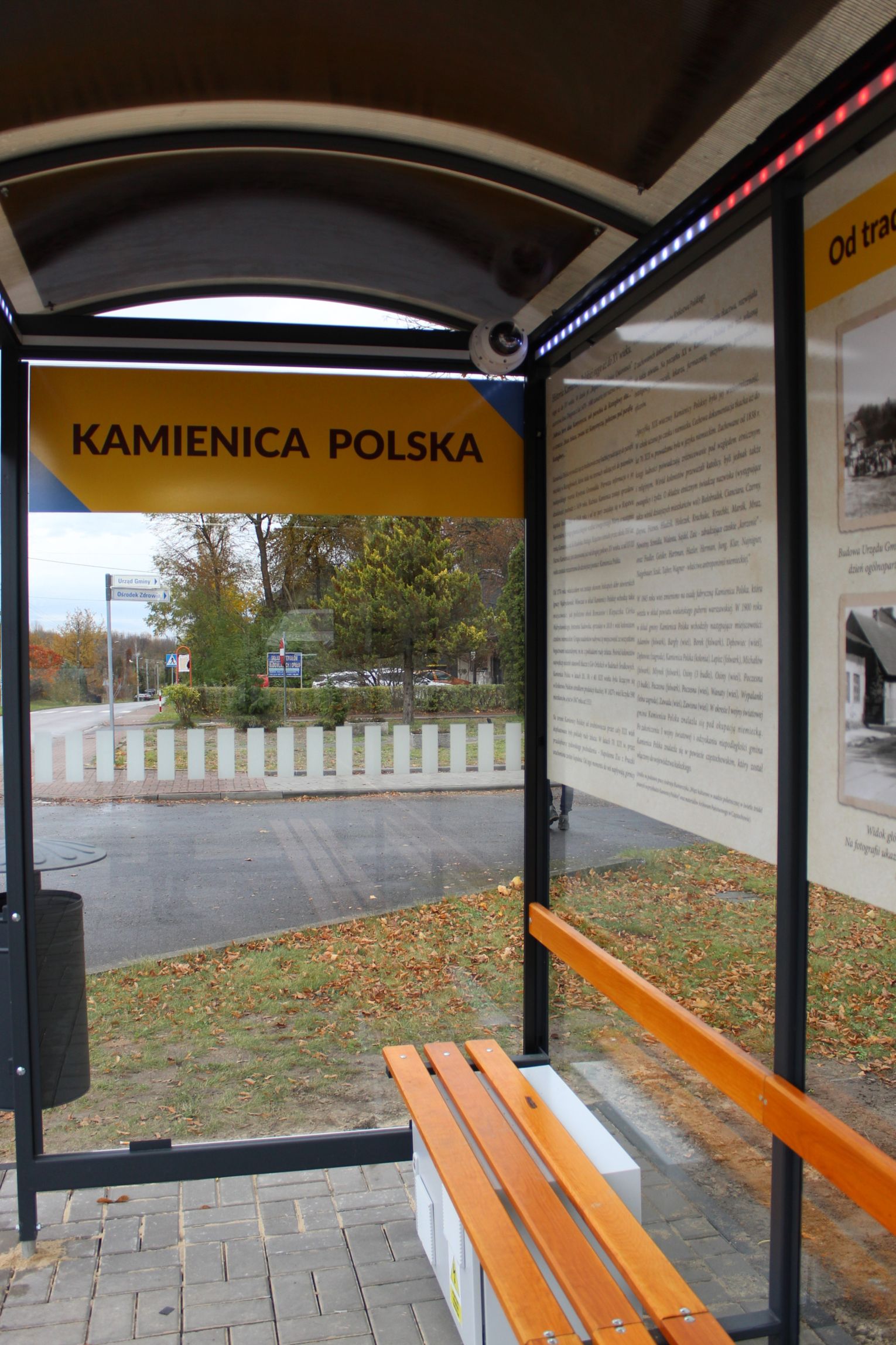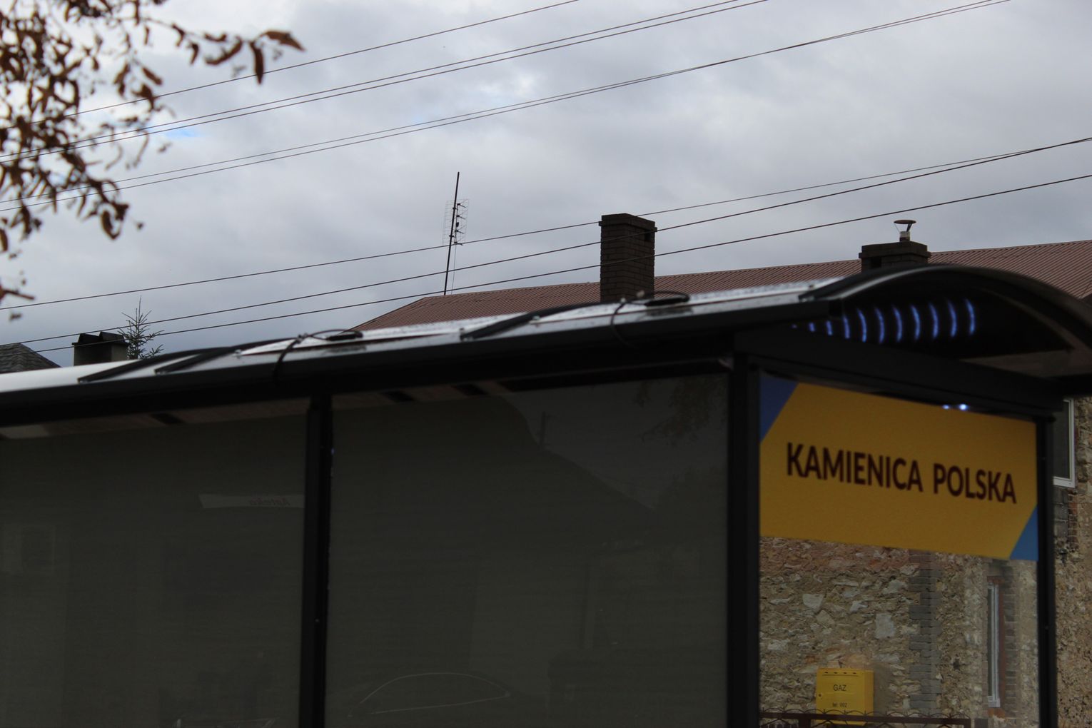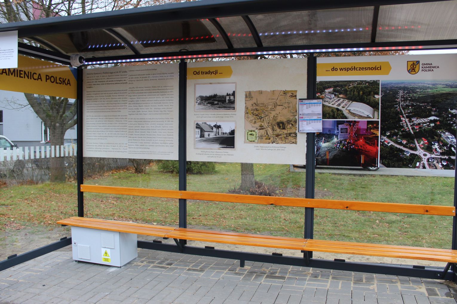 Konstrukcja wiaty została wykonana z ocynkowanych, malowanych proszkowo profili stalowych, a jej ściany wypełnia hartowane szkło o grubości 6 mm. Dach wykonano z poliwęglanu komorowego z filtrem UV, co zapewnia trwałość i ochronę przed warunkami atmosferycznymi. Wiata została posadowiona na utwardzonym terenie i wyposażona w ławeczkę oraz kosz na śmieci. Na ścianach wiaty umieszczono personalizowaną folię przeciwsłoneczną ze zdjęciami Sołectwa Kamienica Polska oraz ciekawostkami o miejscowości – dzięki czemu oczekiwanie na autobus staje się przyjemniejsze i bardziej lokalne.