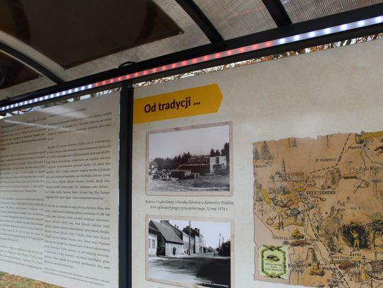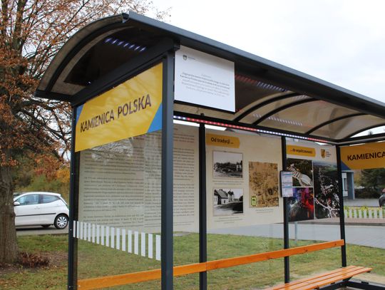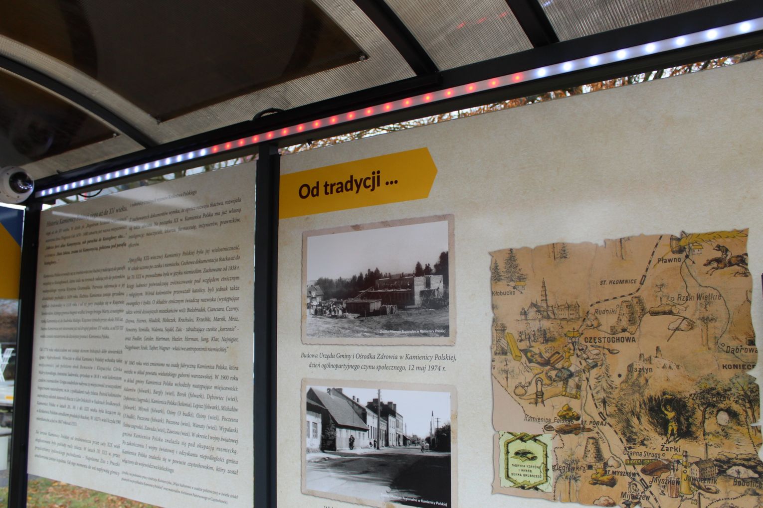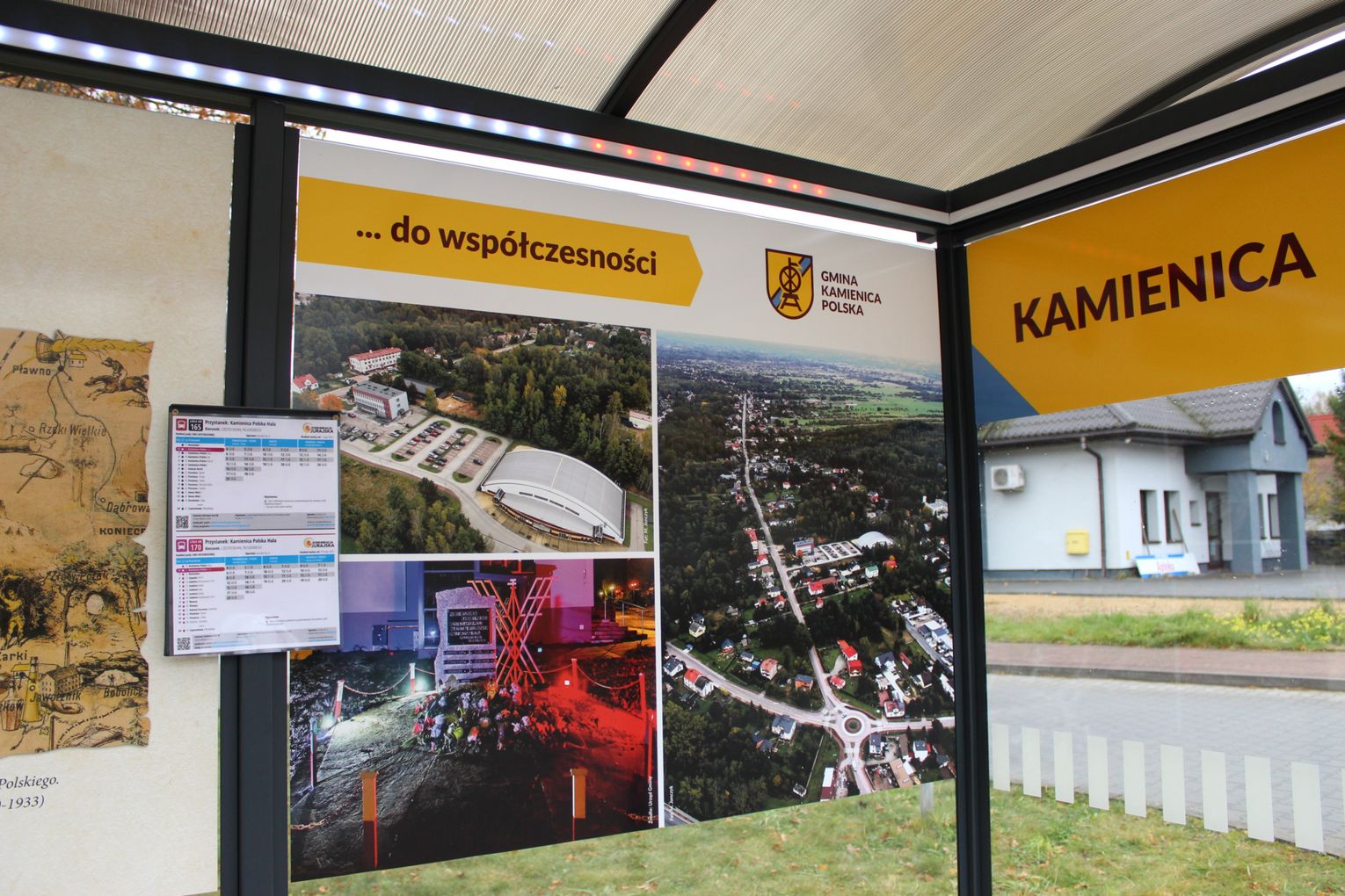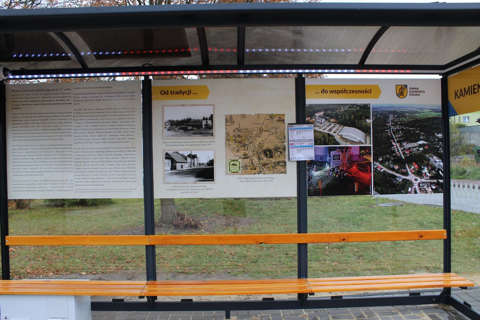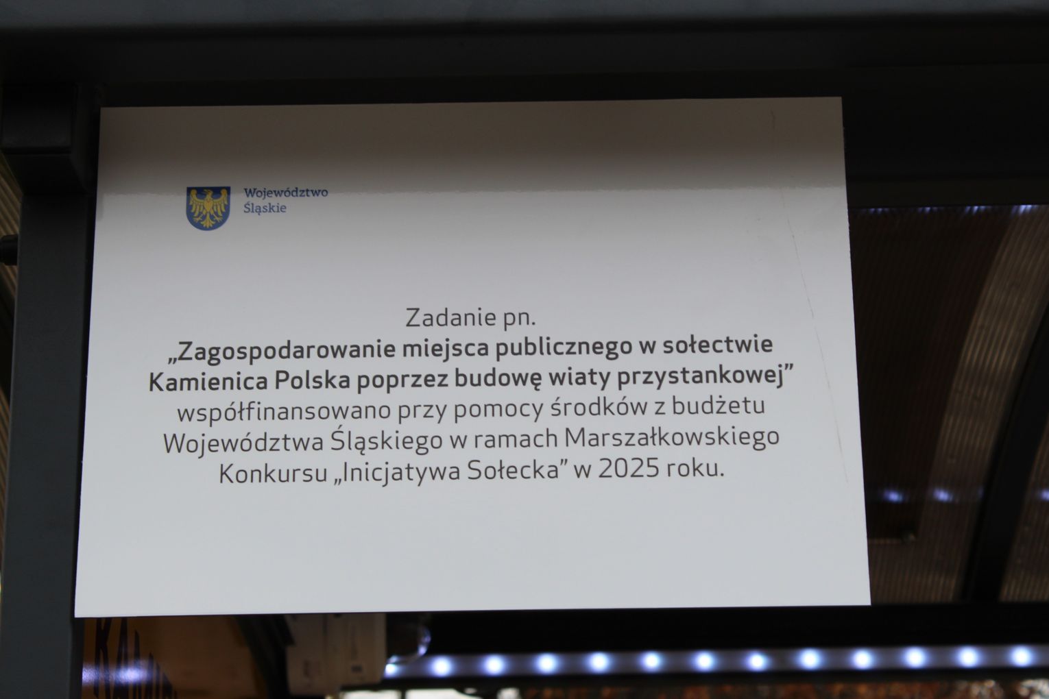 Konstrukcja wiaty została wykonana z ocynkowanych, malowanych proszkowo profili stalowych, a jej ściany wypełnia hartowane szkło o grubości 6 mm. Dach wykonano z poliwęglanu komorowego z filtrem UV, co zapewnia trwałość i ochronę przed warunkami atmosferycznymi. Wiata została posadowiona na utwardzonym terenie i wyposażona w ławeczkę oraz kosz na śmieci. Na ścianach wiaty umieszczono personalizowaną folię przeciwsłoneczną ze zdjęciami Sołectwa Kamienica Polska oraz ciekawostkami o miejscowości – dzięki czemu oczekiwanie na autobus staje się przyjemniejsze i bardziej lokalne.