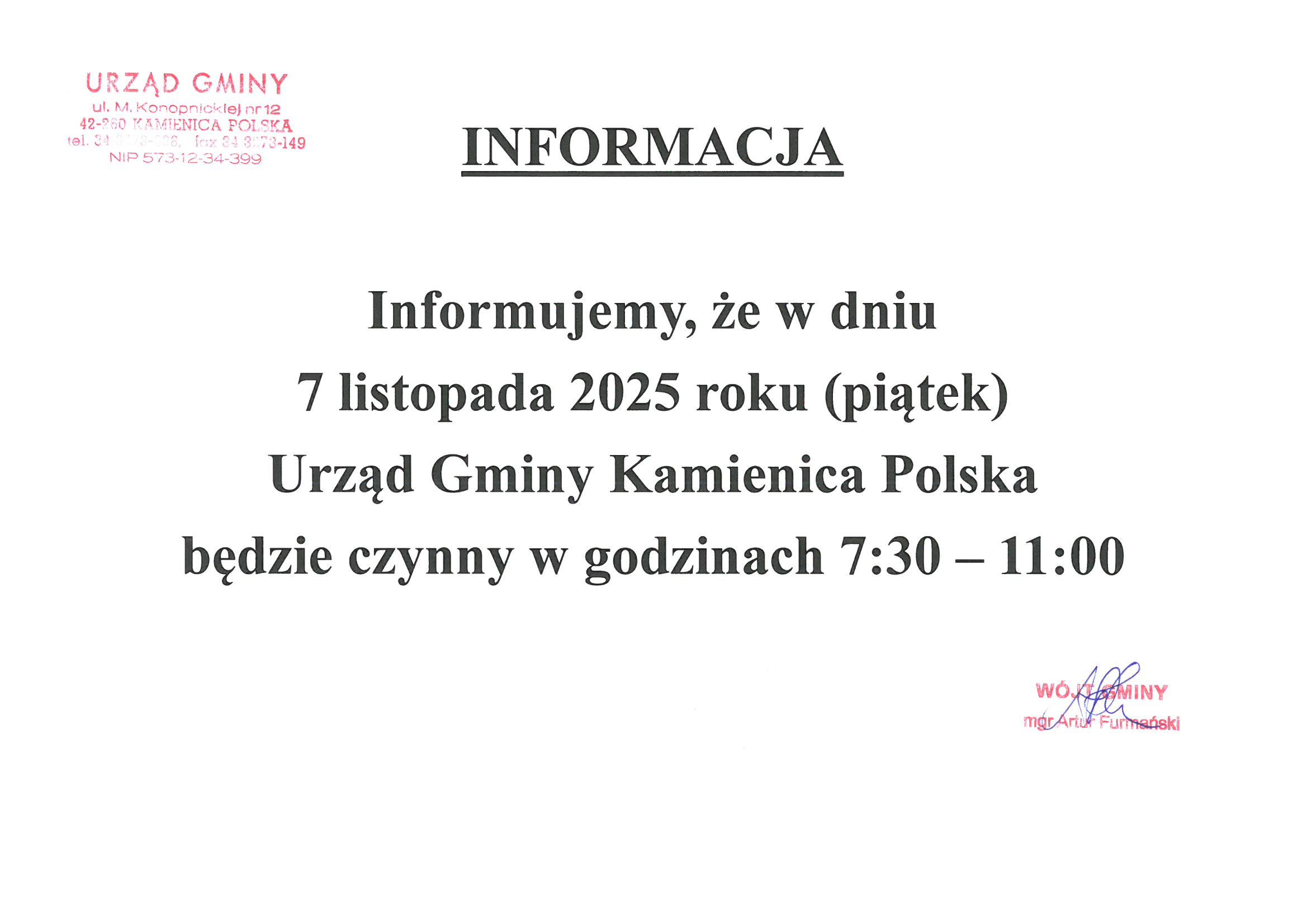 Informacja dot. godzin pracy Urzędu Gminy w Kamienicy Polskiej w dniu 07.11.2025r.
