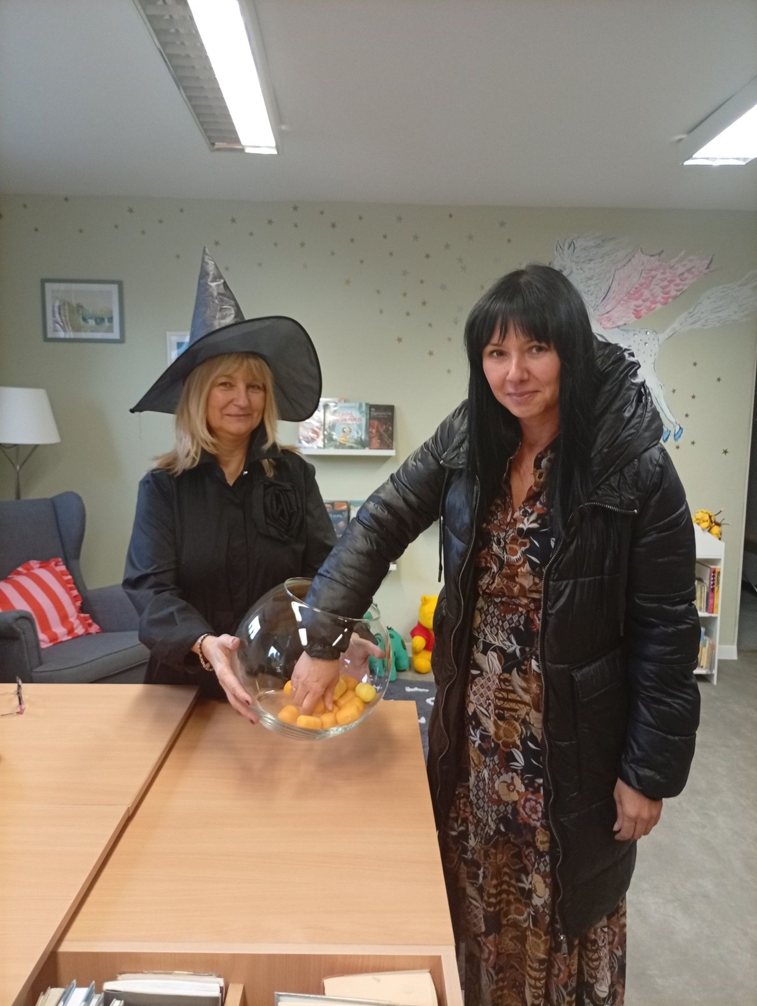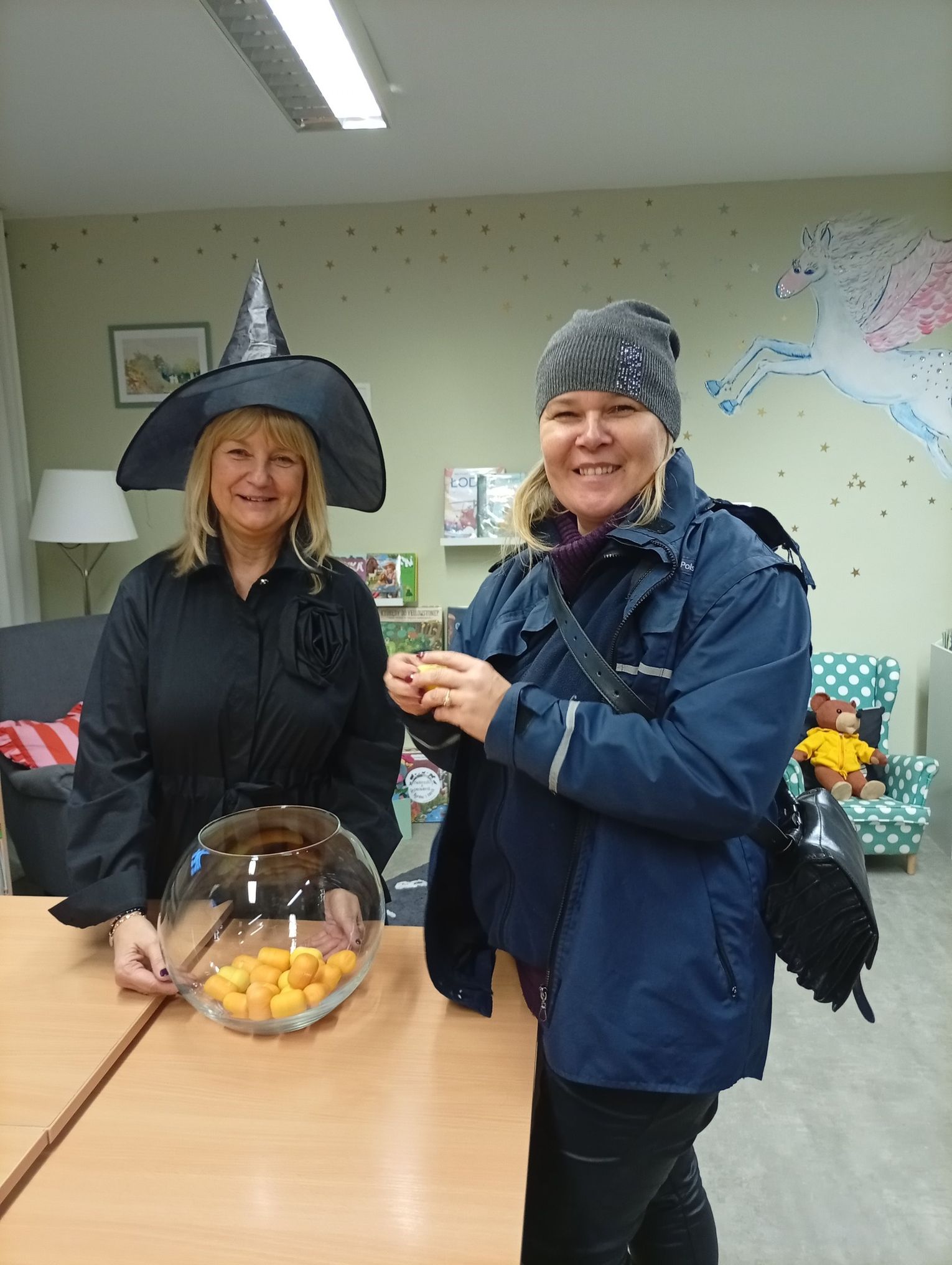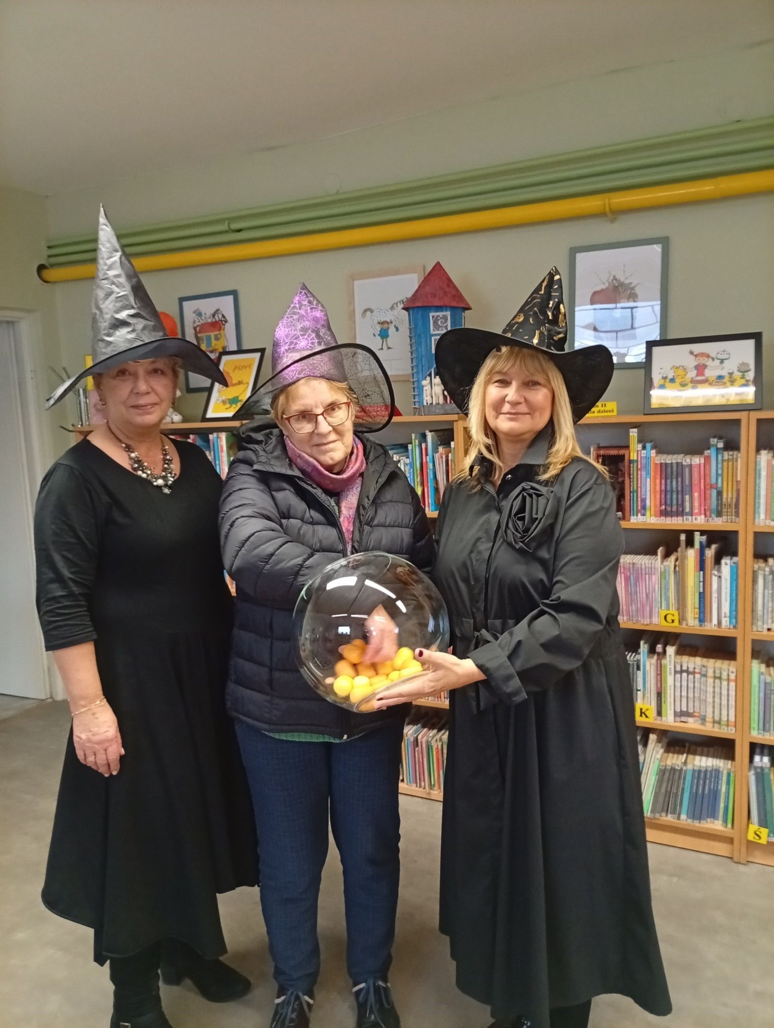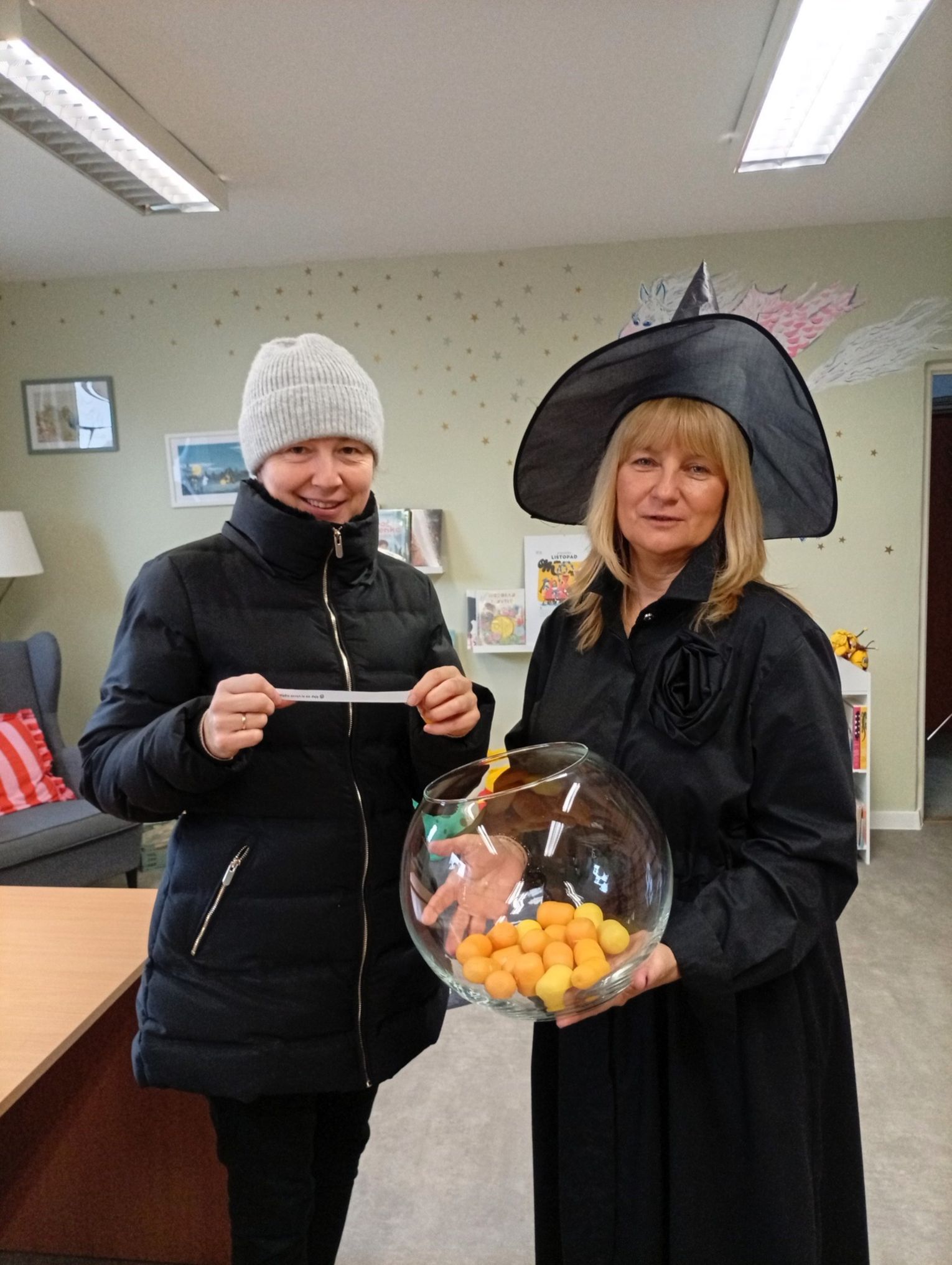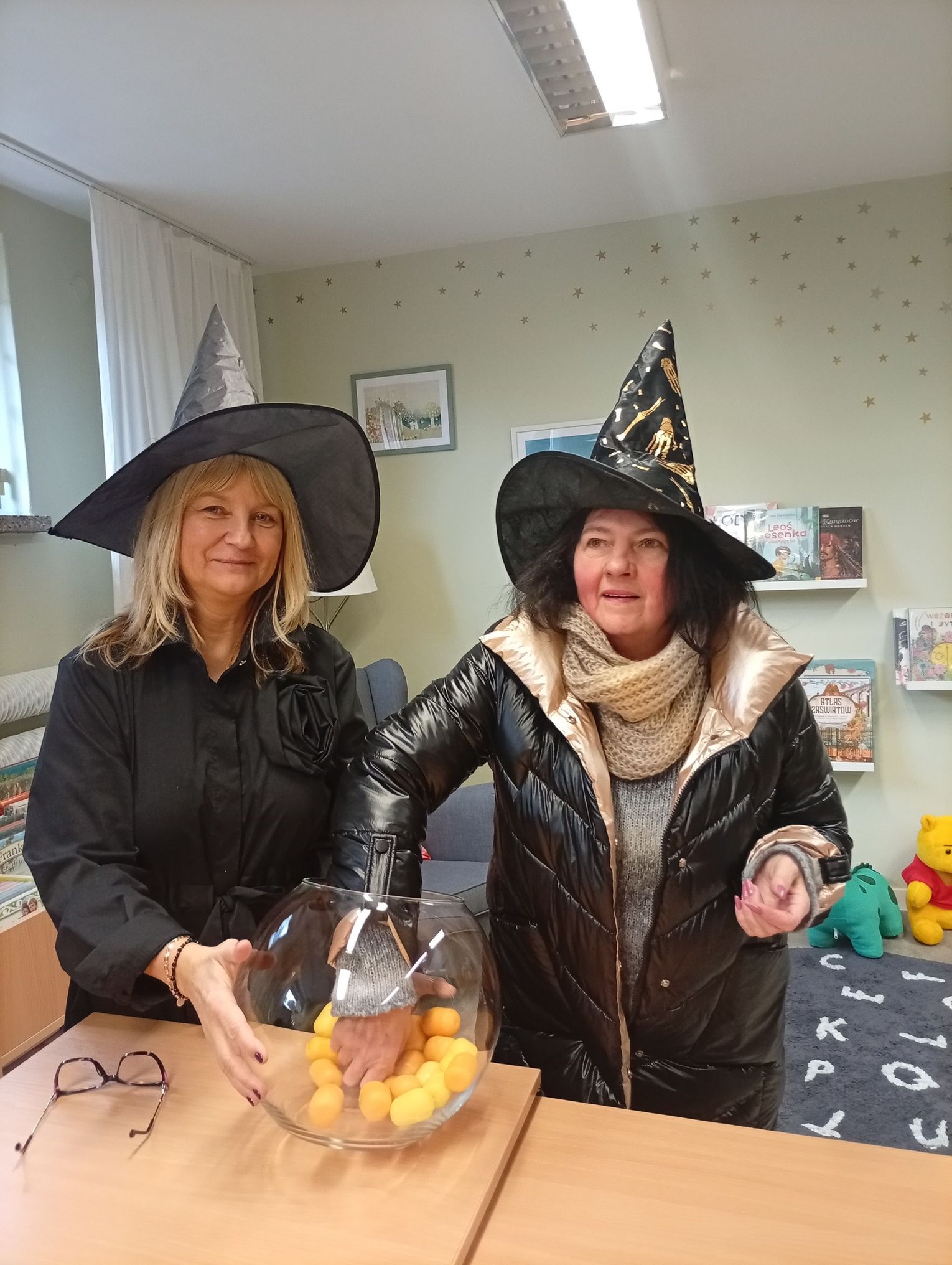 Panie bibliotekarki zadbały o wyjątkową atmosferę — pojawiły się w andrzejkowych kapeluszach, co wywołało wiele uśmiechów wśród odwiedzających.