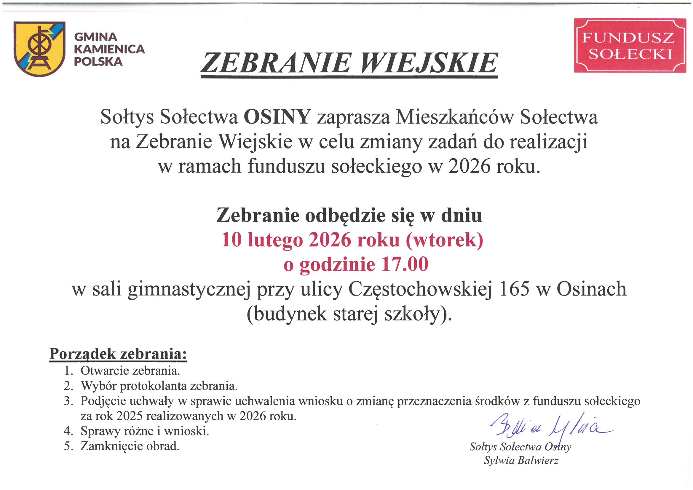 Serdecznie zapraszamy Mieszka艅c贸w Osin do udzia艂u w zebraniu wiejskim w dniu 10 lutego br. o godz. 17:00 w sali gimnastycznej przy ulicy Cz臋stochowskiej 165 w Osinach.