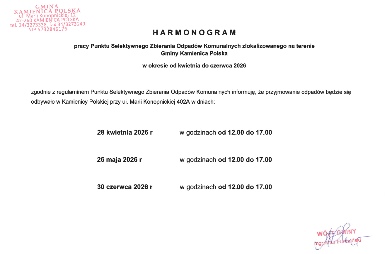 Harmonogram pracy PSZOK: kwiecień - czerwiec 2026 r.