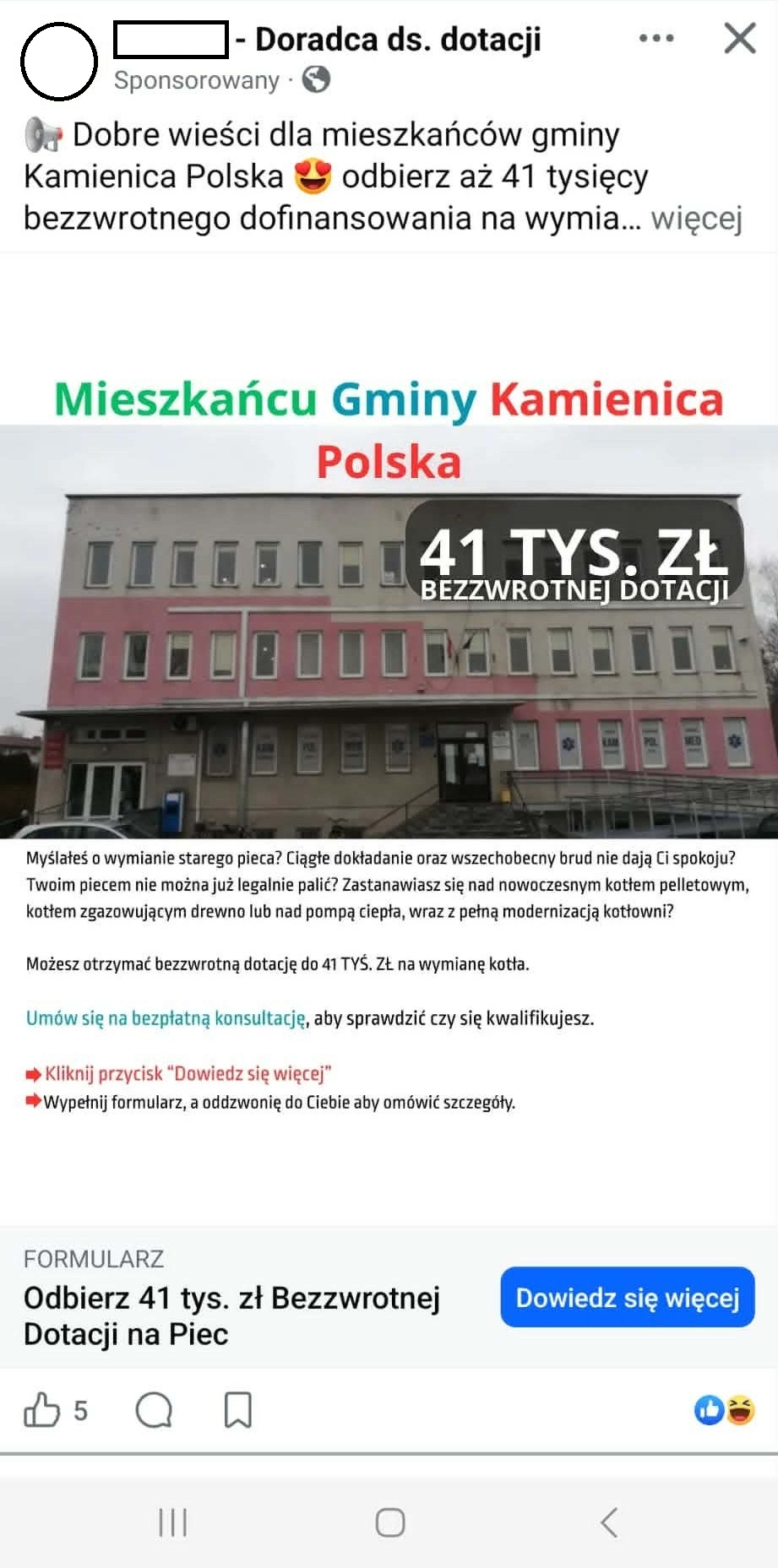 docierają do nas informacje o pojawiających się w mediach społecznościowych reklamach oraz ofertach dotyczących rzekomych „bezzwrotnych dotacji” na wymianę pieców, które mogą wprowadzać w błąd.